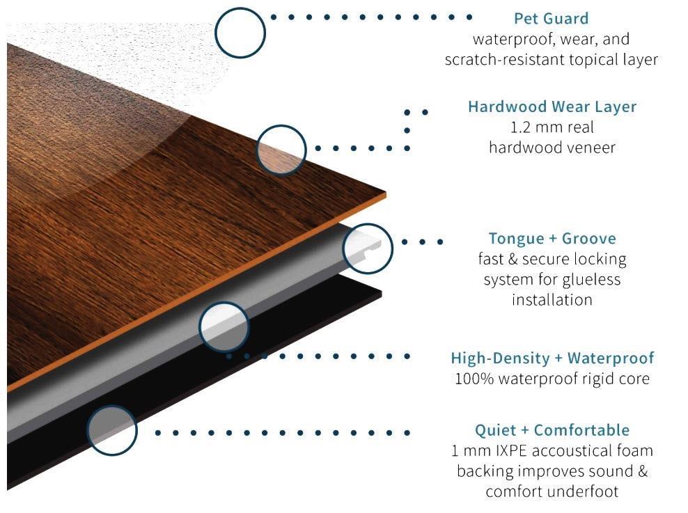 7.2 mm thick, 47 mil hickory wear layer. Waterproof and scratch resistant